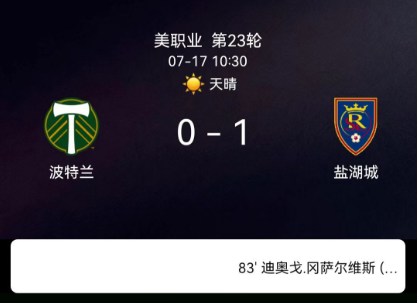 北京时间7月17日,美国职业大联盟常规赛,波特兰伐木者主场迎战皇家盐湖城。比赛进行至第83分钟,皇家盐湖城球员皮奥尔送出助攻,迪奥戈-贡萨尔维斯抓住机会完成破门,打入全场唯一进球。最终比分定格为波特兰伐木者0-1皇家盐湖城。