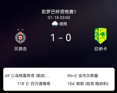 北京时间7月18日,欧足联欧洲联赛资格赛第一轮次回合,贝尔格莱德游击队与AEK拉纳卡展开较量。比赛中,贝尔格莱德游击队球员乌格雷希奇在一次进攻中成功破门,为球队取得领先。AEK拉纳卡则由佩雷-庞斯在加时赛阶段打入关键进球,将比分扳平。比赛过程中,AEK拉纳卡球员安杰尔斯基在补时阶段错失点球机会。最终,双方以1比1结束本场比赛,两回合总比分为贝尔格莱德游击队1-2AEK拉纳卡。