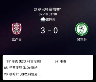 北京时间7月18日欧足联欧洲联赛资格赛第一轮次回合,克卢日对阵保克什。克卢日菲卡破门,蒙泰亚努破门,穆哈尔破门。最终比分克卢日3-0保克什。两回合总比分克卢日3-0保克什。