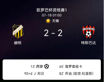 欧足联欧洲联赛资格赛第一轮次回合,赫根与特尔纳瓦斯巴达展开激烈对决。比赛中,赫根球员西蒙-古斯塔夫松通过点球为球队首开纪录,随后特尔纳瓦斯巴达由普罗哈兹卡扳平比分。比赛后段,特尔纳瓦斯巴达通过杜里什助攻莫伊斯茨拉皮什维利再度取得领先。终场前,赫根球员约翰-保罗-登贝破门,将比分定格为2-2。两回合总比分赫根以3-2战胜对手。