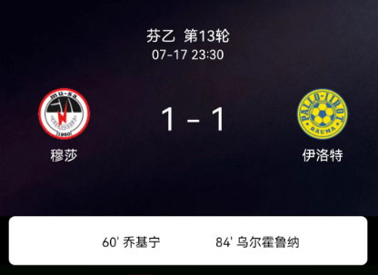 北京时间7月17日,芬兰足球乙级联赛B组第13轮,穆莎坐镇主场迎战伊罗特。比赛中,穆莎球员RasmusJokinen成功破门,为球队取得领先。随后,伊罗特球员UrhoRouna也攻入一球,将比分扳平。最终双方以1-1握手言和。