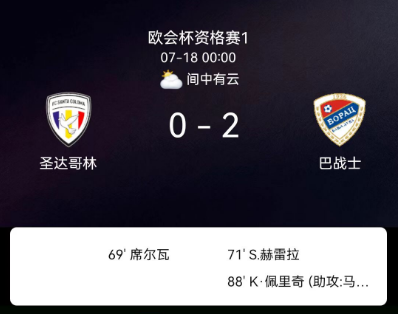 北京时间7月18日,欧洲协会联赛资格赛第一轮次回合展开角逐,圣科洛马迎战巴尼亚卢卡战士。比赛中,圣科洛马球员乌戈-费雷拉在第69分钟因累计两张黄牌被罚下场。随后,巴尼亚卢卡战士抓住机会,由塞瓦斯蒂安-埃雷拉和佩里奇先后攻入两球。最终,巴尼亚卢卡战士以2比0战胜圣科洛马。两回合总比分圣科洛马4-3巴尼亚卢卡战士。