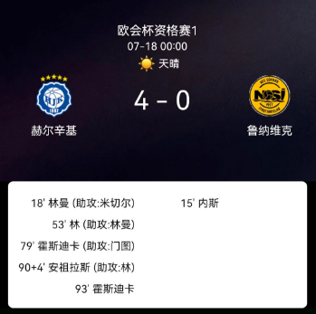 北京时间7月18日,欧洲协会联赛资格赛第一轮次回合,赫尔辛基对阵鲁纳维克,首回合,赫尔辛基0-4惨败鲁纳维克,次回合中,林曼破门,鲁纳维克球员埃米尔-约恩森自摆乌龙,安措拉斯补时阶段破门完成绝平,霍斯蒂卡梅开二度+绝杀。最终比分赫尔辛基5-0鲁纳维克。两回合总比分赫尔辛基5-4鲁纳维克。