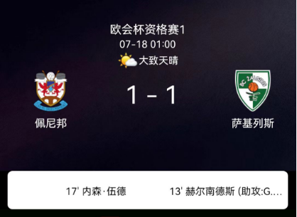 北京时间7月18日,欧洲协会联赛资格赛第一轮次回合,佩尼邦特迎战考纳斯扎尔吉里斯。比赛中,考纳斯扎尔吉里斯球员西尔格达斯送出助攻,埃尔南德斯成功破门,为球队取得领先。随后,佩尼邦特由JamesCrole助攻内森-伍德扳平比分。最终双方以1比1战平结束本场比赛。结合首回合成绩,两回合总比分为佩尼邦特1-4考纳斯扎尔吉里斯。