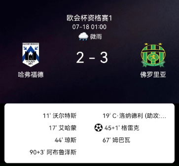 北京时间7月18日欧洲协会联赛资格赛第一轮次回合,哈弗福德韦斯特对阵弗洛里亚纳。哈弗福德韦斯特GregWalters破门,BenAhmun破门。弗洛里亚纳洛纳德利破门,姆莫姆布瓦破门,格里奇破门。最终比分哈弗福德韦斯特2-3弗洛里亚纳。两回合总比分哈弗福德韦斯特3-5弗洛里亚纳。