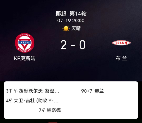 北京时间7月19日挪威足球超级联赛联赛第14轮,KFUM奥斯陆主场对阵布兰。KFUM奥斯陆JohannesNu?ez破门,DavidHickson破门。最终比分KFUM奥斯陆2-0布兰。