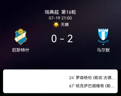 北京时间7月19日,瑞典足球超级联赛第16轮,奥斯达主场迎战马尔默。比赛中,马尔默球员奥托-罗森格伦率先打破僵局,随后他又送出一次精准助攻,帮助哈克萨巴诺维奇扩大比分。最终马尔默以2比0战胜奥斯达。