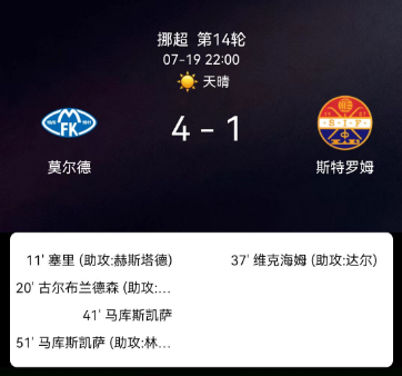北京时间7月19日挪威足球超级联赛联赛第14轮,莫尔德主场对阵斯托姆加斯特。莫尔德扎迪-塞里破门,居尔布兰森破门,卡萨梅开二度。斯托姆加斯特维克海姆破门。最终比分莫尔德4-1斯托姆加斯特。