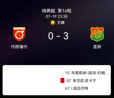 北京时间7月19日,瑞典足球超级联赛第16轮,代格福什坐镇主场迎战加尔斯。比赛中,加尔斯球员MatteodeBrienne在队友助攻下率先破门,为球队打开胜利之门。随后,代格福什球员皮卡兰宁不慎自摆乌龙,进一步扩大了对手的领先优势。易卜拉欣-迪亚巴特在下半场再添一球,帮助加尔斯锁定胜局。最终全场比赛结束,加尔斯以3比0的比分客场完胜代格福什。