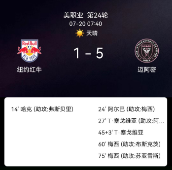 北京时间7月20日,美国职业大联盟常规赛展开角逐,纽约红牛坐镇主场迎战迈阿密国际。比赛中,纽约红牛由亚历山大-哈克打入一球。迈阿密国际方面,阿尔巴取得进球,塞戈维亚与梅西各自完成梅开二度。最终,迈阿密国际以5比1的比分客场战胜纽约红牛。