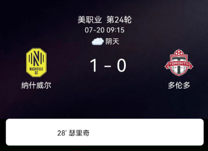 北京时间7月20日美国职业大联盟常规赛,纳什维尔主场迎战多伦多。比赛中,纳什维尔球员瑟里奇在第28分钟打入全场唯一进球。最终比分纳什维尔1-0多伦多。