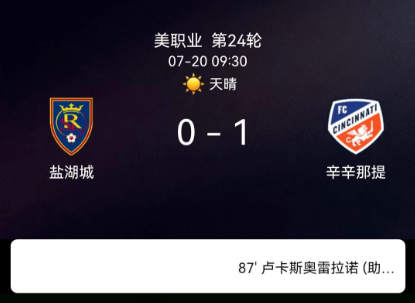 北京时间7月20日,美国职业大联盟常规赛,皇家盐湖城主场迎战辛辛那提。比赛中,奥雷利亚诺接阿努恩加助攻打入全场唯一进球。最终比分皇家盐湖城0-1辛辛那提。