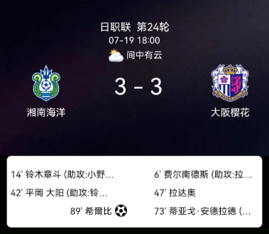 北京时间7月19日,日本职业联赛J1联赛第24轮,湘南比马坐镇主场迎战大阪樱花。比赛中,湘南比马的铃木章斗、平冈大阳和路易斯-费利佩分别取得进球,大阪樱花方面则由卢卡斯-费尔南德斯、拉斐尔-拉唐和蒂亚戈-安德拉德攻破对方球门。比赛过程中,小野濑康介为铃木章斗送上助攻,铃木章斗随后又助攻平冈大阳破门。拉斐尔-拉唐在上半场完成梅开二度,香川真司在下半场为蒂亚戈-安德拉德送出关键传球。路易斯-费利佩在比赛尾声主罚点球命中,帮助球队扳平比分。最终,双方以3比3握手言和。