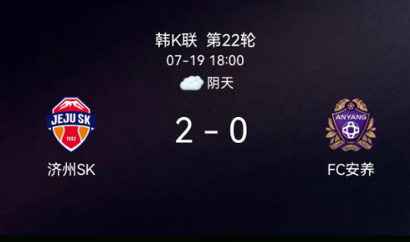 7月19日,韩国经典K联赛第22轮,济州SK坐镇主场迎战安养。比赛中,济州SK由吴宰奕和尤里各入一球,最终以2比0战胜对手,全取三分。
