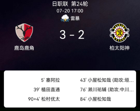 北京时间7月20日日本职业联赛J1第24轮,鹿岛鹿角主场迎战柏太阳神。比赛中,鹿岛鹿角球员莱奥-塞阿拉率先破门,为球队首开纪录;随后植田直通再下一城,帮助球队扩大领先优势。柏太阳神方面,垣田裕晖送出助攻,小屋松知哉推射建功,为球队扳回一城。下半场,中川敦瑛送出助攻,濑川祐辅破门,将比分扳平。比赛尾声阶段,小屋松知哉主罚点球未能命中,错失良机。补时阶段,鹿岛鹿角球员松村优太打入绝杀进球。最终,鹿岛鹿角以3比2战胜柏太阳神。