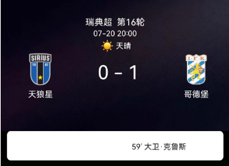 北京时间7月20日,瑞典足球超级联赛第16轮,天狼星主场迎战哥德堡。比赛中,哥德堡球员戴维-克鲁泽在关键时刻打入全场唯一进球。最终比分天狼星0-1哥德堡。