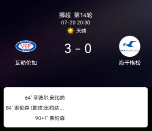 北京时间7月20日,挪威足球超级联赛第14轮,瓦勒伦加坐镇主场迎战海于格松。比赛中,瓦勒伦加球员FidelBriceAmbina率先破门,为球队打开胜利之门。随后,布乔达尔送出助攻,帮助埃利亚斯-瑟伦森攻入一球。下半场补时阶段,埃利亚斯-瑟伦森再入一球,完成梅开二度。最终,瓦勒伦加以3比0的比分战胜海于格松。