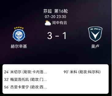 北京时间7月20日,芬兰足球超级联赛第16轮,赫尔辛基主场迎战奥卢。赫尔辛基由米歇尔、梅里洛托和卡利宁分别取得进球,奥卢则由皮特卡宁打入一球。最终,赫尔辛基以3比1战胜奥卢。关键事件第24分钟:卡内洛普洛斯助攻米歇尔破门,赫尔辛基1-0领先。第32分钟:门图助攻梅里洛托扩大比分,2-0。第56分钟:KaiusSimojoki助攻卡利宁再下一城,3-0。第90分钟:EetuSaarela助攻皮特卡宁为奥卢扳回一球,最终3-1。