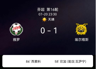 北京时间7月20日,芬兰足球超级联赛第16轮,雅罗主场迎战埃尔维斯。比赛中,埃尔维斯球员贾德尔-康加攻入全场唯一进球,为球队取得领先。比赛尾声阶段,雅罗球员西索科被红牌罚下,进一步削弱了主队的追分希望。最终,埃尔维斯客场以1比0战胜雅罗,全取三分。关键事件第58分钟:埃尔维斯球员贾德尔-康加破门,打入全场制胜球。