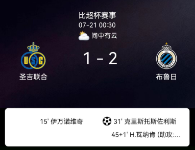 7月21日,比利时超级杯赛事展开角逐,圣吉罗斯联合与布鲁日展开激烈对决。比赛中,圣吉罗斯联合球员弗拉尼奥-伊万诺维奇成功打入一球。随后,布鲁日球员措利斯通过点球机会扳平比分。上半场补时阶段,措利斯送出助攻,帮助队友瓦纳肯完成破门。最终,布鲁日以2比1战胜圣吉罗斯联合,夺得赛事冠军。