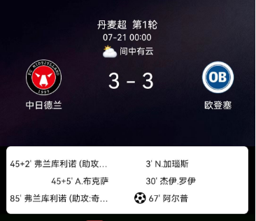 北京时间7月21日丹麦足球超级联赛联赛第1轮,中日德兰主场对阵欧登塞。中日德兰弗兰库利诺-朱梅开二度,布克萨破门。欧登塞加瑙斯破门,格罗特破门,阿尔普破门。最终比分中日德兰3-3欧登塞。