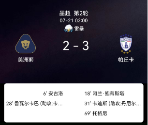 北京时间7月21日,墨西哥足球超级联赛春季联赛第2轮,美洲狮坐镇主场迎战帕丘卡。比赛开始后,美洲狮由安古洛率先破门。随后,帕丘卡由阿兰-包蒂斯塔扳平比分。美洲狮由卡拉斯基利亚助攻鲁巴尔卡瓦破门,再次取得领先。上半场临近结束前,帕丘卡由阿塞韦斯助攻卡迪斯破门,将比分扳为2比2。下半场,帕丘卡球员加斯东-托尼打入反超比分的一球。最终,帕丘卡客场3比2逆转美洲狮。