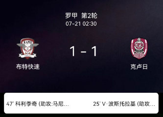 北京时间7月21日,罗马尼亚足球甲级联赛第2轮,布加勒斯特快速主场迎战克卢日。比赛中,克卢日球员波斯托拉基接穆哈尔助攻率先破门;下半场,布加勒斯特快速由马尼亚助攻科尔吉奇扳平比分。最终双方以1-1握手言和。关键事件第25分钟:穆哈尔助攻波斯托拉基推射破门,克卢日1-0领先。第47分钟:马尼亚助攻科尔吉奇头球扳平比分,最终双方1-1握手言和。