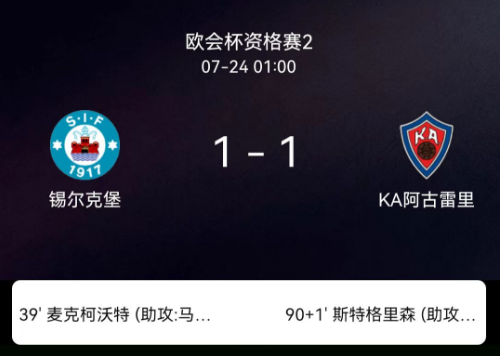 2025年7月24日,欧洲协会联赛资格赛第二轮首回合,锡尔克堡主场1-1战平阿克雷里。麦克科瓦特第38分钟接马特松助攻首开纪录,阿克雷里球员H-施泰因格里姆松补时阶段接罗德里助攻扳平比分。