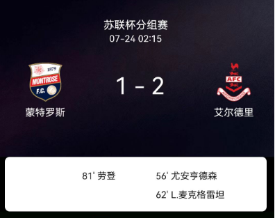 2025年7月24日,苏格兰联赛杯小组赛,艾尔德里联2-1战胜蒙特罗斯。尤安-亨德森首开纪录,麦格拉顿扩大比分,蒙特罗斯球员EwanLoudon终场前扳回一球。