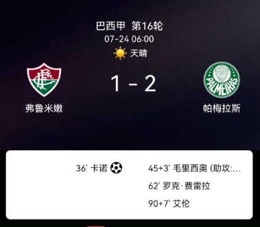 2025年7月24日,巴西足球甲级联赛第16轮,帕尔梅拉斯客场2-1弗鲁米嫩塞。卡诺率先点射破门,毛里西奥补时扳平,维托尔-罗克下半场反超比分,帕尔梅拉斯球员阿兰终场前染红。