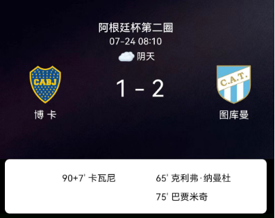 2025年7月24日,阿根廷杯第二轮,图库曼竞技2-1战胜博卡青年晋级。CleverFerreira第65分钟首开纪录,巴哈米奇第75分钟扩大比分,博卡青年补时阶段由卡瓦尼扳回一球。