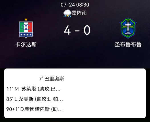 2025年7月24日,南美洲球会杯淘汰赛附加赛次回合,卡尔达斯十一人4-0大胜圣安东尼奥布鲁,两回合总比分7-0晋级。迈克尔-巴里奥斯传射,苏莱塔、皮佩-戈麦斯、基尼奥内斯先后破门。
