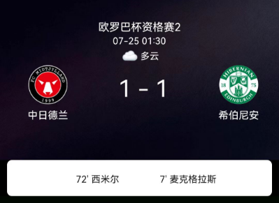 2025年7月25日,欧足联欧洲联赛资格赛第二轮首回合,中日德兰主场1-1战平希伯尼安。麦克格拉斯开场7分钟为客队首开纪录,西姆西尔第72分钟为中日德兰扳平比分。关键事件第7分钟:希伯尼安球员麦克格拉斯直接破门,1-0领先。第72分钟:中日德兰球员西姆西尔打入一球,最终双方1-1握手言和。