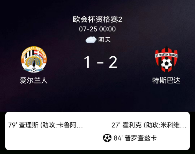 2025年7月25日,欧洲协会联赛资格赛第二轮首回合,特尔纳瓦斯巴达客场2-1逆转希伯尼安斯。霍利克上半场打破僵局,查尔斯顿扳平比分,普罗哈兹卡补时阶段点射制胜。