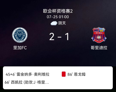 2025年7月25日,欧洲协会联赛资格赛第二轮首回合,里加2-1战胜哥里迪拉。IagoSiqueira助攻雷吉纳尔多-拉米雷斯破门并亲自建功,穆罕默德-恩戈姆自摆乌龙。