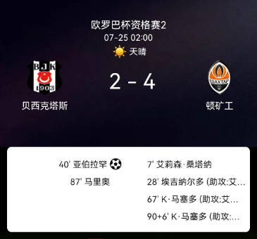 2025年7月25日,欧足联欧洲联赛资格赛第二轮首回合,顿涅茨克矿工4-2击败贝西克塔斯。阿利松、埃吉纳尔多先拔头筹,凯文梅开二度,亚伯拉罕、若昂-马里奥为贝西克塔斯建功。