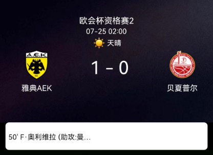 第50分钟:雅典AEK球员曼达洛斯助攻雷尔瓦斯破门,1-0领先。