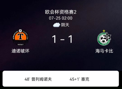 2025年7月25日,欧洲协会联赛资格赛第二轮首回合,若基诺鱼雷(兹霍迪诺)1-1战平海法马卡比。塞克上半场补时破门,普雷穆德罗夫下半场扳平比分。