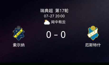 北京时间7月27日,瑞典足球超级联赛第17轮,AIK索尔纳主场0-0战平奥斯达。全场比赛双方多次尝试进攻但均无建树,最终以平局结束。