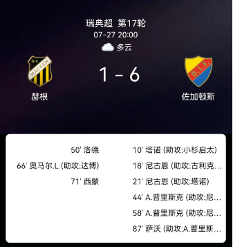 北京时间7月27日瑞典足球超级联赛联赛第17轮,赫根主场对阵尤尔加登。赫根拉尤尼破门。尤尔加登滕霍破门,恩根梅开二度,普里斯克梅开二度,扎卡里亚-萨沃破门。最终比分赫根1-6尤尔加登。