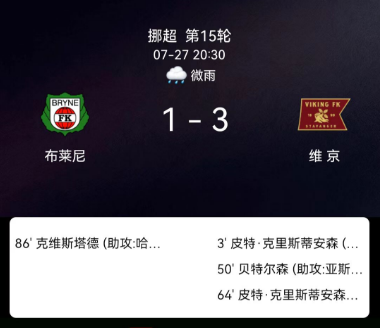 北京时间7月27日,挪威足球超级联赛第15轮,布莱尼主场迎战维京。比赛第3分钟,维京球员特里皮奇送出助攻,克里斯蒂安森破门得分。第50分钟,维京球员阿斯基尔德森助攻巴特尔森攻入一球。第64分钟,特里皮奇再次送出助攻,克里斯蒂安森完成梅开二度。第86分钟,布莱尼球员KristianSkurveHland助攻LasseQvigstad打入一球。最终,维京以3比1的比分客场战胜布莱尼。