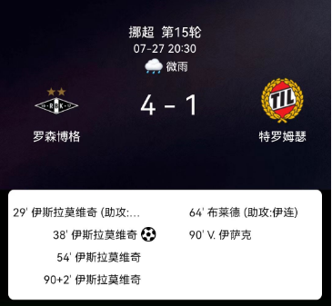北京时间7月27日,挪威足球超级联赛第15轮,罗森博格主场4-1大胜特罗姆瑟。伊斯拉莫维奇包揽四球(含一点球),特罗姆瑟仅由丹尼尔-布劳特挽回一球。