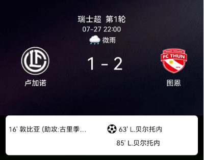 北京时间7月27日,瑞士足球超级联赛第1轮,卢加诺主场迎战图恩。比赛中,卢加诺球员奥斯曼-敦比亚接格尔吉奇助攻率先破门。随后,图恩球员贝尔托内通过点球扳回一城,并在比赛后期再入一球完成梅开二度。最终,图恩以2比1战胜卢加诺。