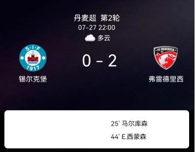 7月27日,丹麦足球超级联赛第2轮,锡尔克堡主场迎战腓特烈西亚。比赛中,腓特烈西亚球员马克森率先打破僵局,随后西蒙森再下一城。全场比赛结束,锡尔克堡0-2不敌腓特烈西亚。