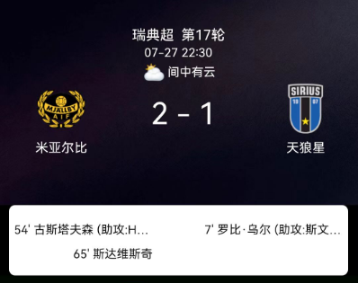 北京时间7月27日,瑞典足球超级联赛第17轮,米亚尔比坐镇主场迎战天狼星。比赛开始后,天狼星由罗比-尤尔接应VictorSvensson的助攻先拔头筹。随后,米亚尔比展开反击,维克托-古斯塔夫松在队友赫尔曼-约翰松的帮助下扳平比分。比赛进入后段,斯塔维奇挺身而出为米亚尔比反超比分。最终,米亚尔比以2-1战胜天狼星,全取三分。