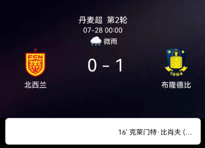 北京时间7月28日,丹麦足球超级联赛第2轮,北西兰主场迎战布隆德比。比赛中,布隆德比球员克莱门特-比朔夫在一次进攻中接队友瓦利斯的助攻成功破门,打入全场唯一进球。最终比分定格为北西兰0-1布隆德比。