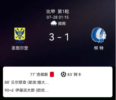 北京时间7月28日,比利时足球甲级联赛第1轮,圣图尔登坐镇主场迎战根特。比赛进程中,根特球员莱昂纳多-洛佩斯不慎自摆乌龙,圣图尔登球员贝尔塔奇尼和伊藤凉太郎分别取得进球,其中贝尔塔奇尼还贡献了一记助攻,帮助球队以3比1的比分战胜对手。