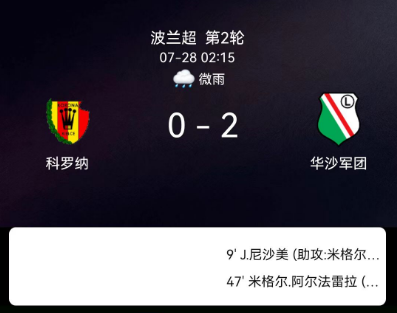 北京时间7月28日,波兰足球超级联赛第2轮,凯尔采王冠坐镇主场迎战华沙莱吉亚。比赛中,华沙莱吉亚由恩萨梅和阿尔法雷拉各入一球,帮助球队取得领先。最终,凯尔采王冠主场0-2不敌华沙莱吉亚。