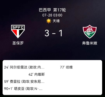 北京时间7月28日巴西足球甲级联赛联赛第17轮,圣保罗主场对阵弗鲁米嫩塞。圣保罗罗伯特-阿沃莱达破门,费雷拉破门,塔皮亚破门。弗鲁米嫩塞萨穆埃尔-沙维尔破门。最终比分圣保罗3-1弗鲁米嫩塞。