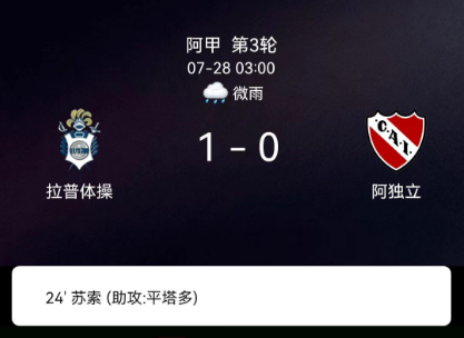 北京时间7月28日,阿根廷足球超级联赛秋季联赛第3轮,拉普拉塔体操主场1-0击败独立竞技。加斯东-苏索接平塔多助攻打入全场唯一进球,主队零封取胜。